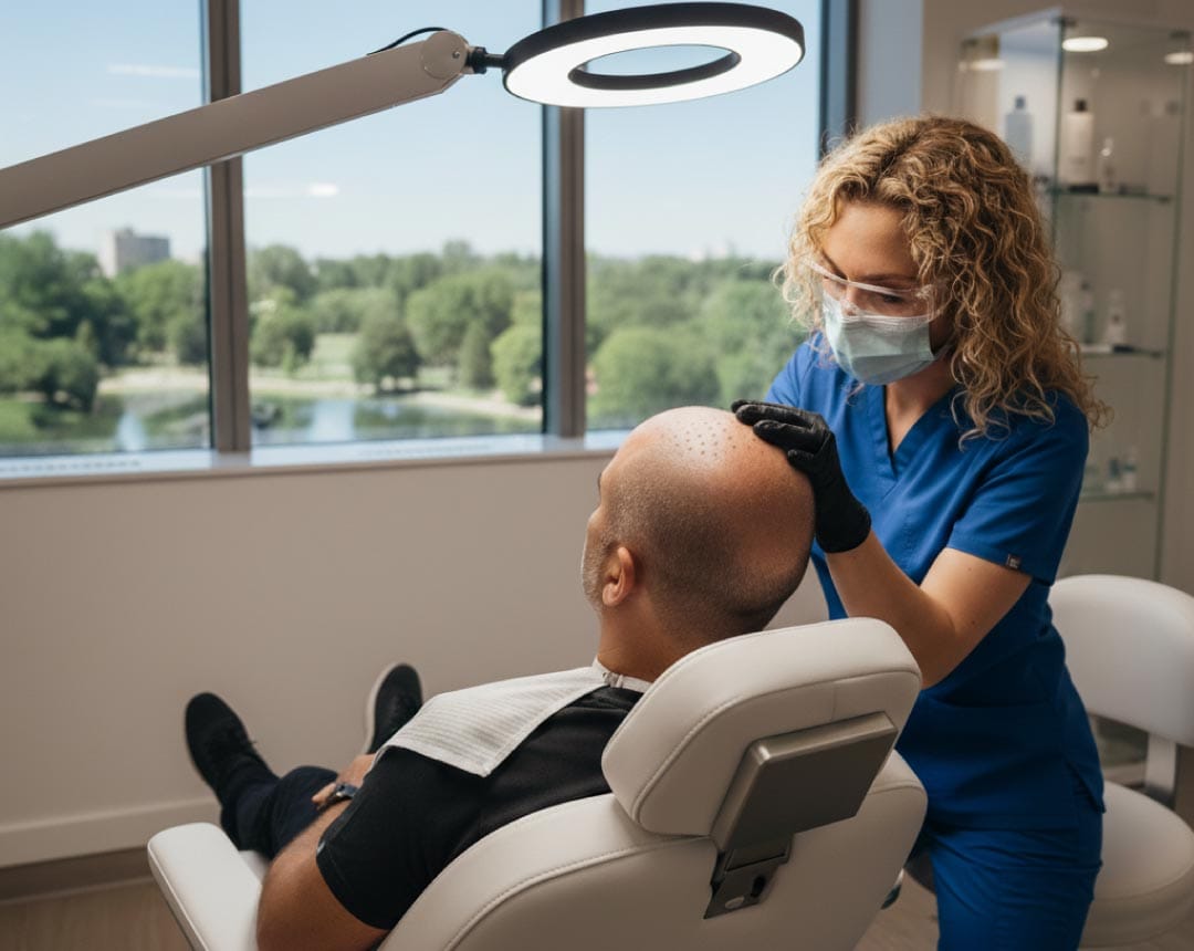 Inmediatamente después del procedimiento, el cuero cabelludo generará una ligera costra y tendrá un tono más oscuro del deseado, que se aclarará con los días. Es crucial no rozar, rascar ni frotar la zona. Se debe evitar exposición al sol y, una vez curado, es imprescindible usar protector solar en el cuero cabelludo para proteger el pigmento.